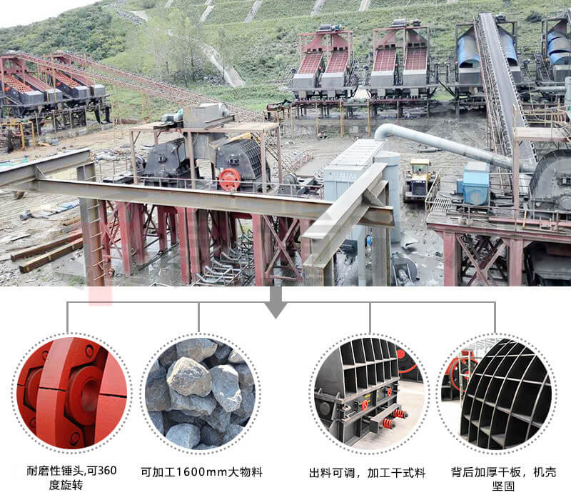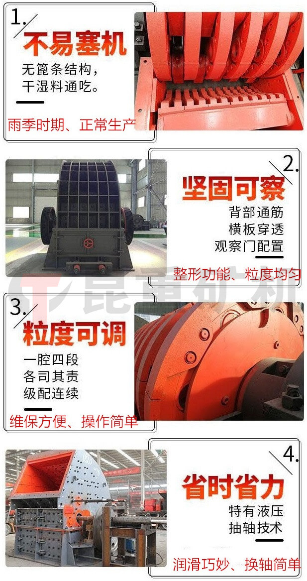 重錘式破碎機采用無蓖條設計,產量大,無堵塞,出料可調。一破成型替代顎式破碎機與反擊式破碎機的聯合作業與傳統錘破相比,昆重礦機采用獨特無蓖條設計,通過調整活動反擊板與轉子上錘頭回轉軌跡圓之間的距離,調整出料粒度的大小,大大降低出粉率,揚塵大大減少,更環保實用。進料口大具備鄂破可以吃大料功能,同時具備反擊破整形功能。同時可破碎濕料,下雨天不影響生產,解決了傳統錘破易堵塞、易卡機、產量低的難題。