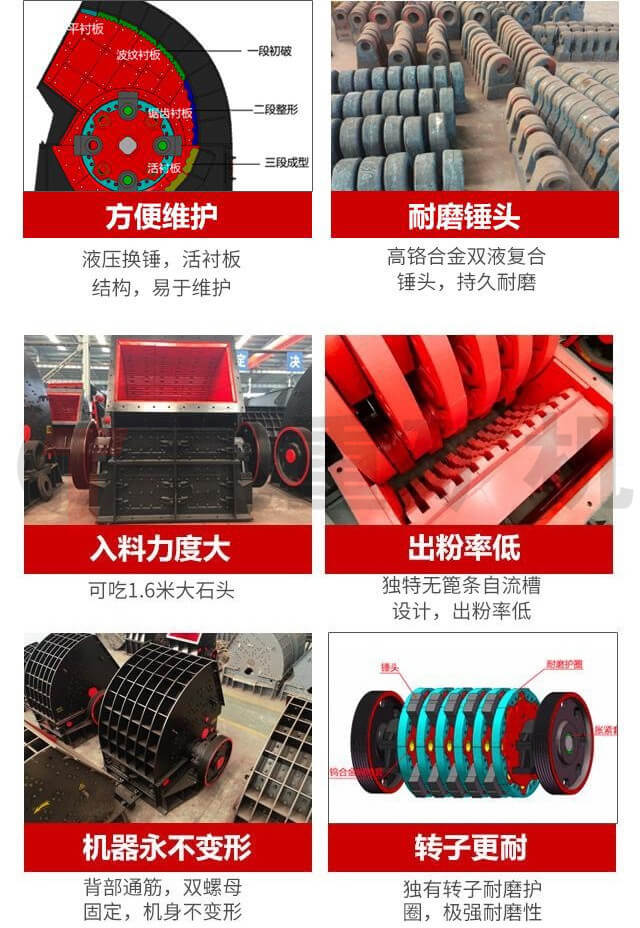 重錘式破碎機采用4種反擊板,3段破碎,粒型更完美,弧形機殼,通筋結構,反擊板鵝蛋絲固定,側襯板11級方丁固定,機殼牢固不易變形。內部反擊板采用4種不同襯板:平襯板、波紋襯板、鋸齒襯板、活襯板。平襯板在機口位置,大物料進入破碎機口沖擊力較大,有效保護機殼。破碎區采用波紋襯板,整形區采用鋸齒襯板對石料進行整形,成型區采用活襯板,自流設計,粒型完美,避免重復破碎,達到粒型的自動排出。