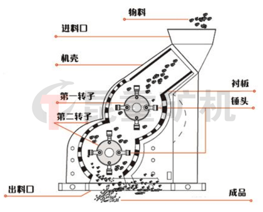 雙級破碎機工作時,在雙電機的帶動下,上下結構雙轉子互相串連的兩套轉子同時高速旋轉,仰擊式雙重粉碎。腔內錘打物料在機內腔經上級轉子擊碎立即被飛速旋轉的下級轉子的錘頭再次細碎,內腔物料相互飛速碰撞、相互粉碎、達到錘粉料、料粉料的效果,一次成形3毫米左右的成品。排料口沒有篩板篦條,混合料通過性能好,濕料不糊不堵。