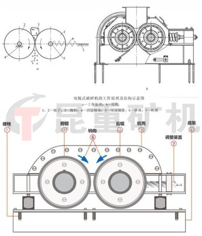 物料由進料口進入輥子之間,通過擠壓作用破碎河卵石,兩輥輪之間有一定的間隙,兩輥輪間隙變大,物料出料粒度變大,在壓緊彈簧的作用下兩輥輪間隙變小,出料粒度變小。通過改變調(diào)整間隙,可以控制物料的出料粒度。對輥制砂機是利用兩個高強度耐磨合金破碎輥,相對旋轉(zhuǎn)產(chǎn)生的高擠壓力來破碎物料,物料進入兩輥間隙(V 型破碎腔)以后,受到兩破碎輥相對旋轉(zhuǎn)的擠壓力和剪切力作用,在擠軋、剪切和嚙磨下,將物料破碎成需要的粒度從排料口排出。
