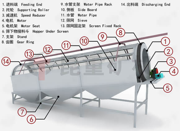 滾筒篩主要有電機(jī)、減速機(jī)、滾筒裝置、機(jī)架、密封蓋、進(jìn)出料口組成。筒體一般分三段,可視具體情況而定,篩孔由小到大排列,每一段上的篩孔孔徑相同。為了提高篩分效率,物料在滾筒篩內(nèi)移動的速度不能太快,否則將造成篩分不充分、不徹底,因此滾筒篩一般都有嚴(yán)格規(guī)定的安裝傾角,通常來說角度為5°,在實(shí)際情況下,可根據(jù)需要進(jìn)行調(diào)整。滾筒段是通過螺母、螺釘與滾筒篩轉(zhuǎn)盤相連接的,因此滾筒段的安裝與拆卸比較方便。由于滾筒段與轉(zhuǎn)盤相連,當(dāng)轉(zhuǎn)盤在驅(qū)動裝置的驅(qū)動下發(fā)生轉(zhuǎn)動時(shí),滾筒段也跟著一起轉(zhuǎn)動。